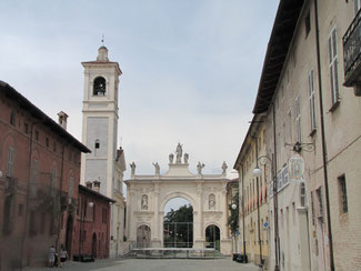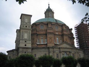 Wallfahrtsortes von Vicoforte. Der architektonische Komplex zeigt unterschiedliche Stile: der untere Teil ist Renaissance, die Trommel und die Kuppel sind Barock, die Glockentürme sind